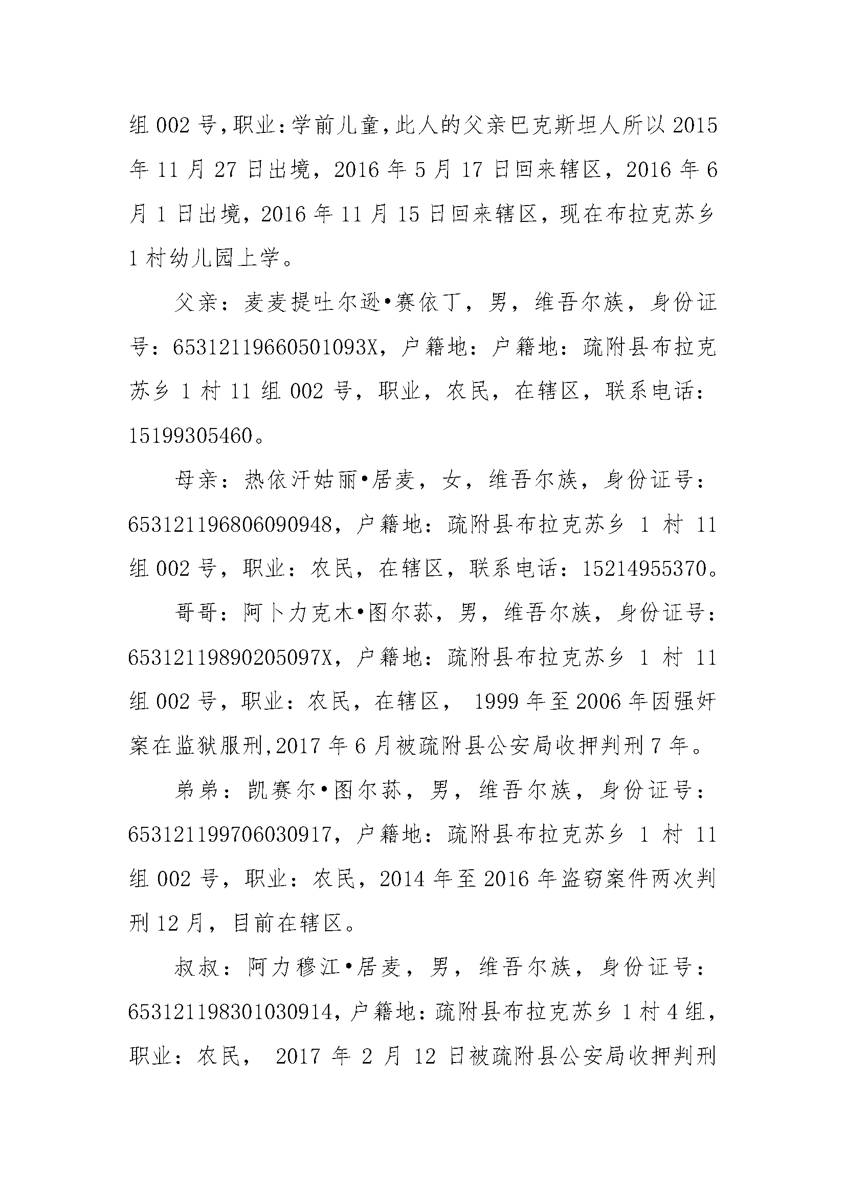 Father: Maimaitituersun Sayidin(مەمەتتۇرسۇن سەيدىن) , male, Uyghur, ID number: 65312119660501093X, registered address: No. 002, Group 11, Village 1, Bulaksu Township, Konasheher County, occupation: farmer, resides in the jurisdiction area, contact number: 15199305460.