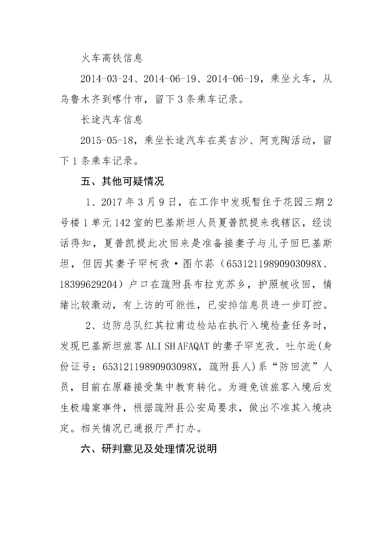 1. On March 9, 2017, during work, it was discovered that a Pakistani national, Shapukaiti, was temporarily residing at Unit 142, Building 2, Phase 3, Garden, came to our jurisdiction. After an interview, it was learned that Shapukaiti had returned to prepare to take his wife and son back to Pakistan. However, because the passport of his wife, Hankezi Tuersun (ID number: 65312119890903098X, phone: 18399629204, Registered residence: Konasheher County, Bulaksu Township) was confiscated, she was emotionally agitated. Due to the possibility of petitioning. An informant has been assigned to further monitor the situation.