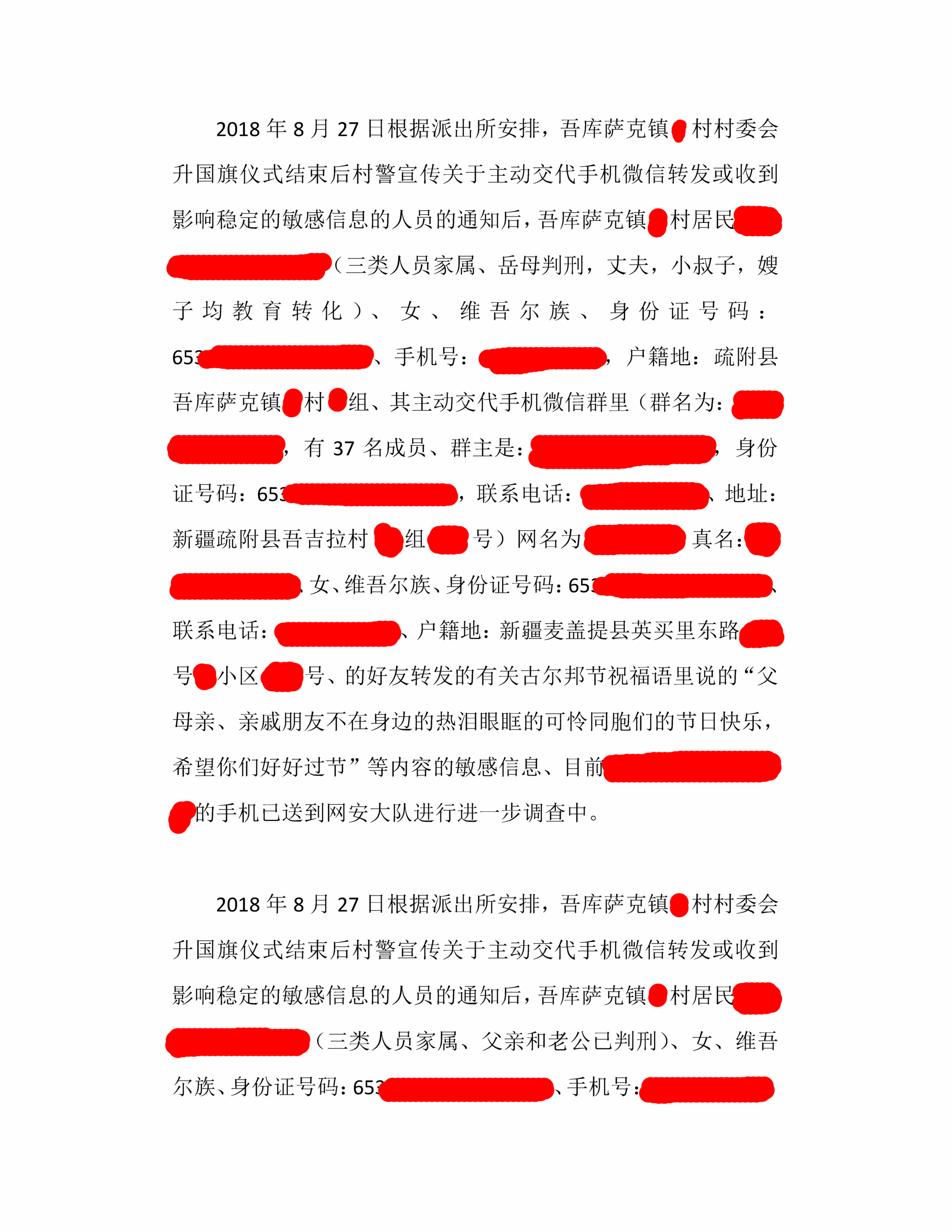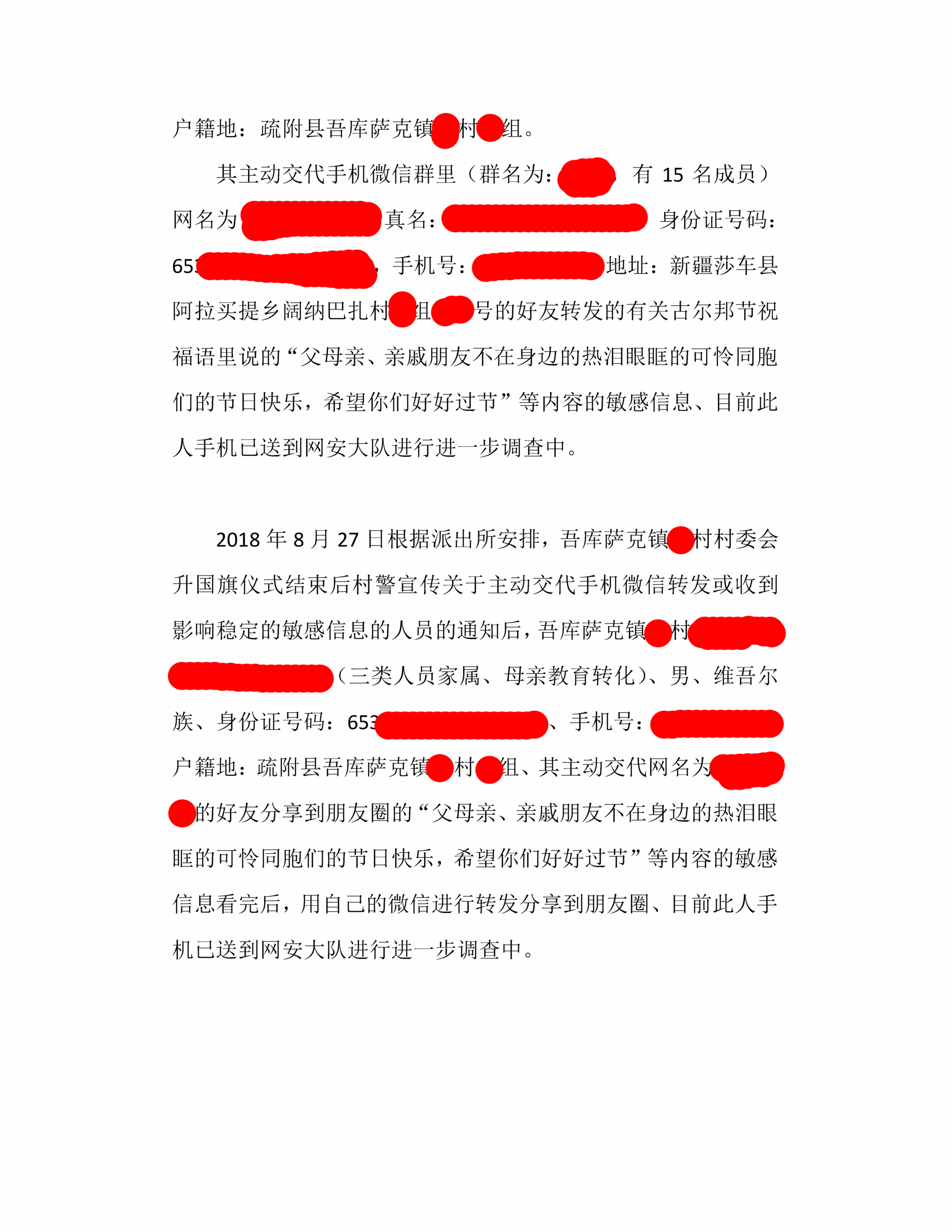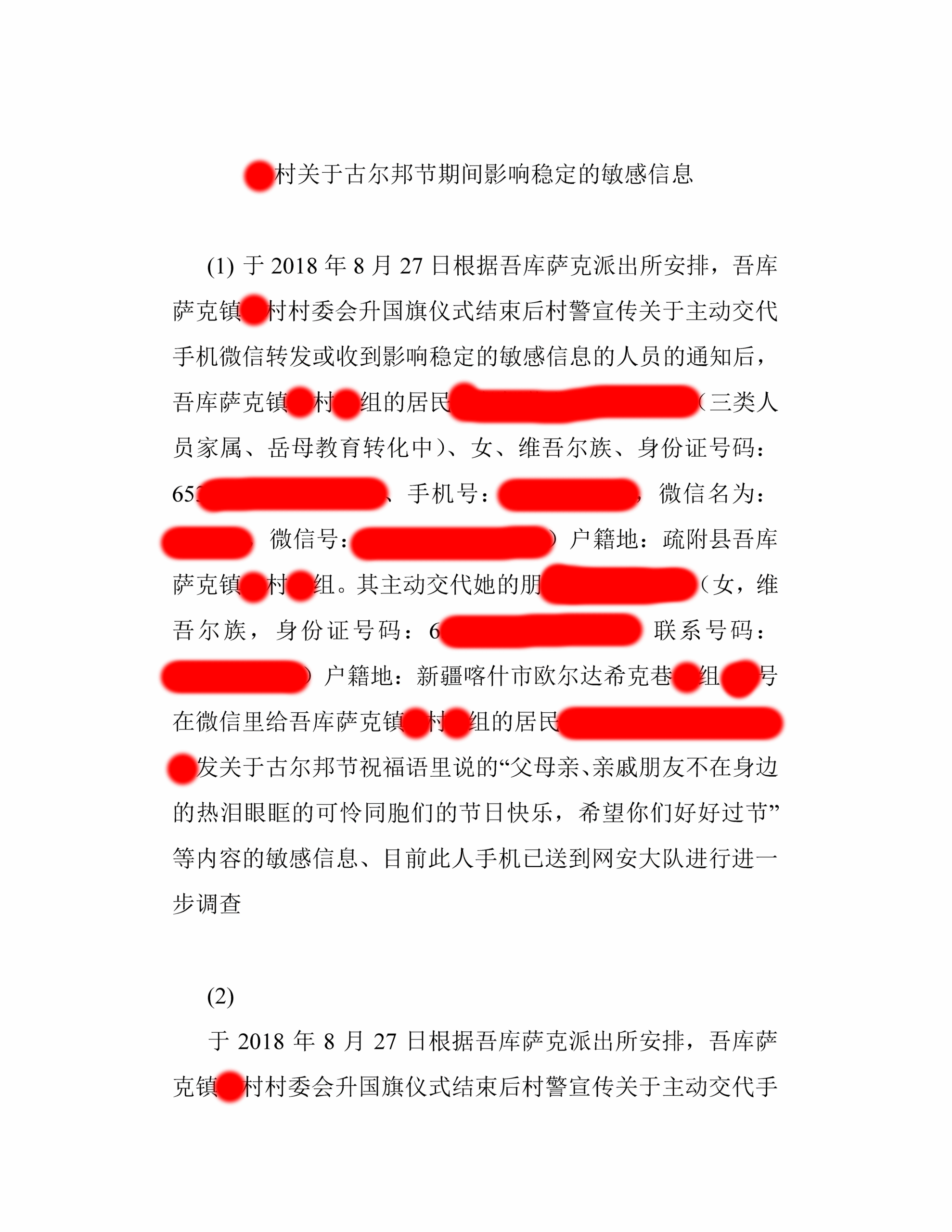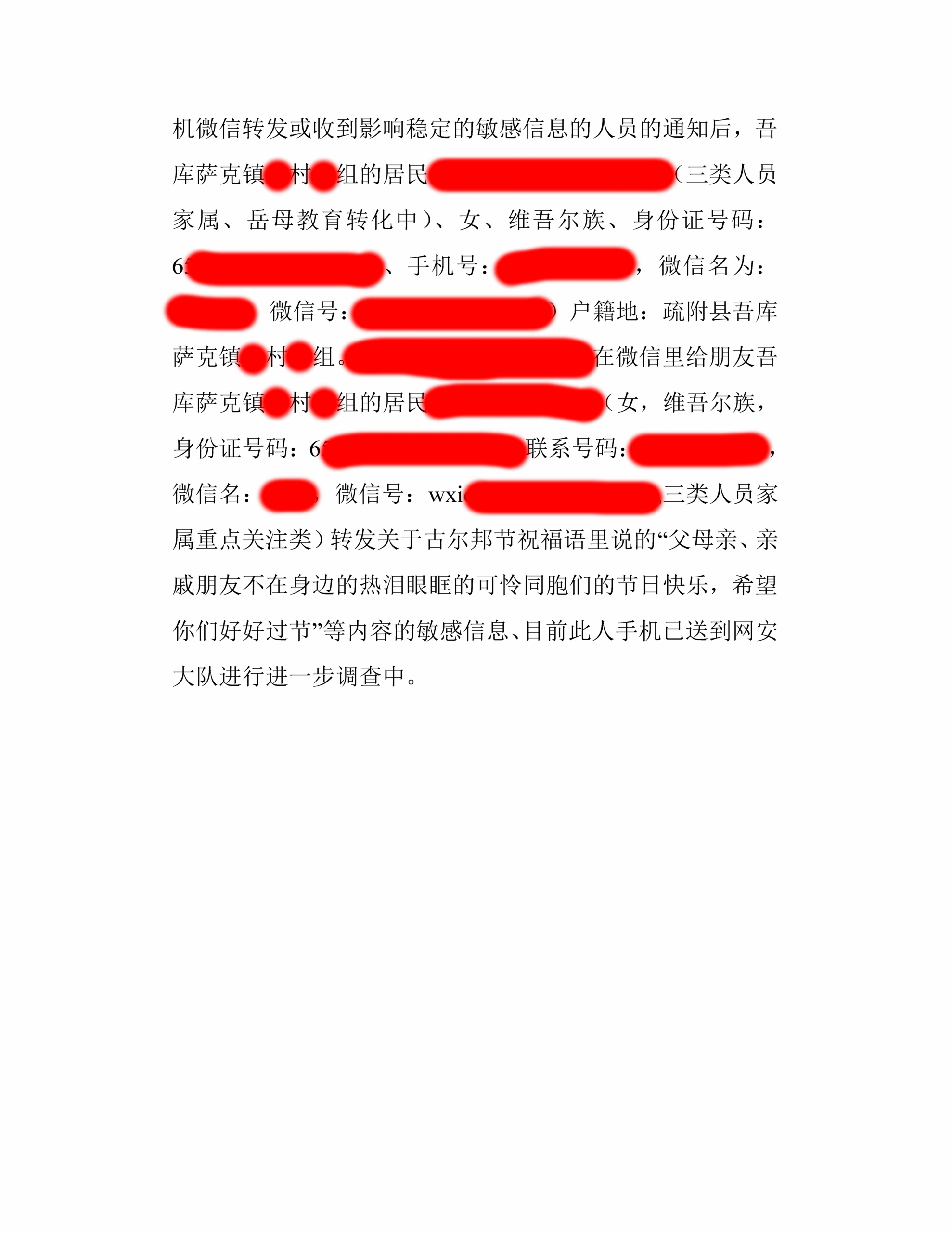 (2) On 27 August 2018, following an arrangement by the Oghisaq Police Station, after the flag‑raising ceremony conducted by the Village 8 Committee of Oghisaq Town, village police announced a notice urging residents to voluntarily disclose any mobile phone or WeChat messages that contained sensitive information potentially affecting stability. After this announcement, Av. x (a family member of Category III personnel’s and Mother-in-Law is under education transformation), female, Uyghur, ID number 6531211xxxxxxxxxxx, mobile xxxxxxxxxxx, WeChat nickname x, WeChat ID xxxx, resident of Group x, Village x, Oghisaq Town, Kona Sheher County [疏附县], sent a WeChat message to her friend AX. x (female, Uyghur, ID number 6531211xxxxxxxxxxx, contact number xxxxxxxxxxx, WeChat nickname x, WeChat ID wxid-xxxx, a key individual under Category III personnel’s family). The message contained the following sensitive content in a Qurban Festival blessing: “May those poor compatriots whose parents and relatives are not by their side, with tear‑filled eyes, have a happy holiday; I hope you enjoy the festival well.” The phone of this person has now been handed over to the Cybersecurity Brigade for further investigation.