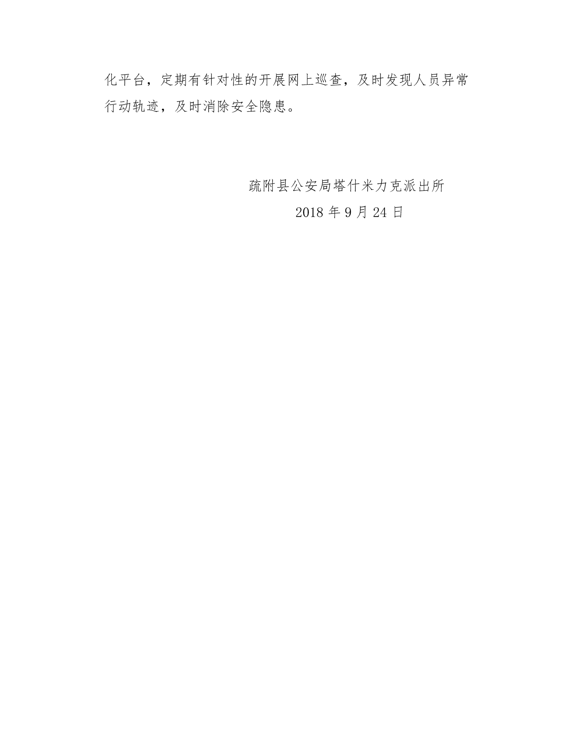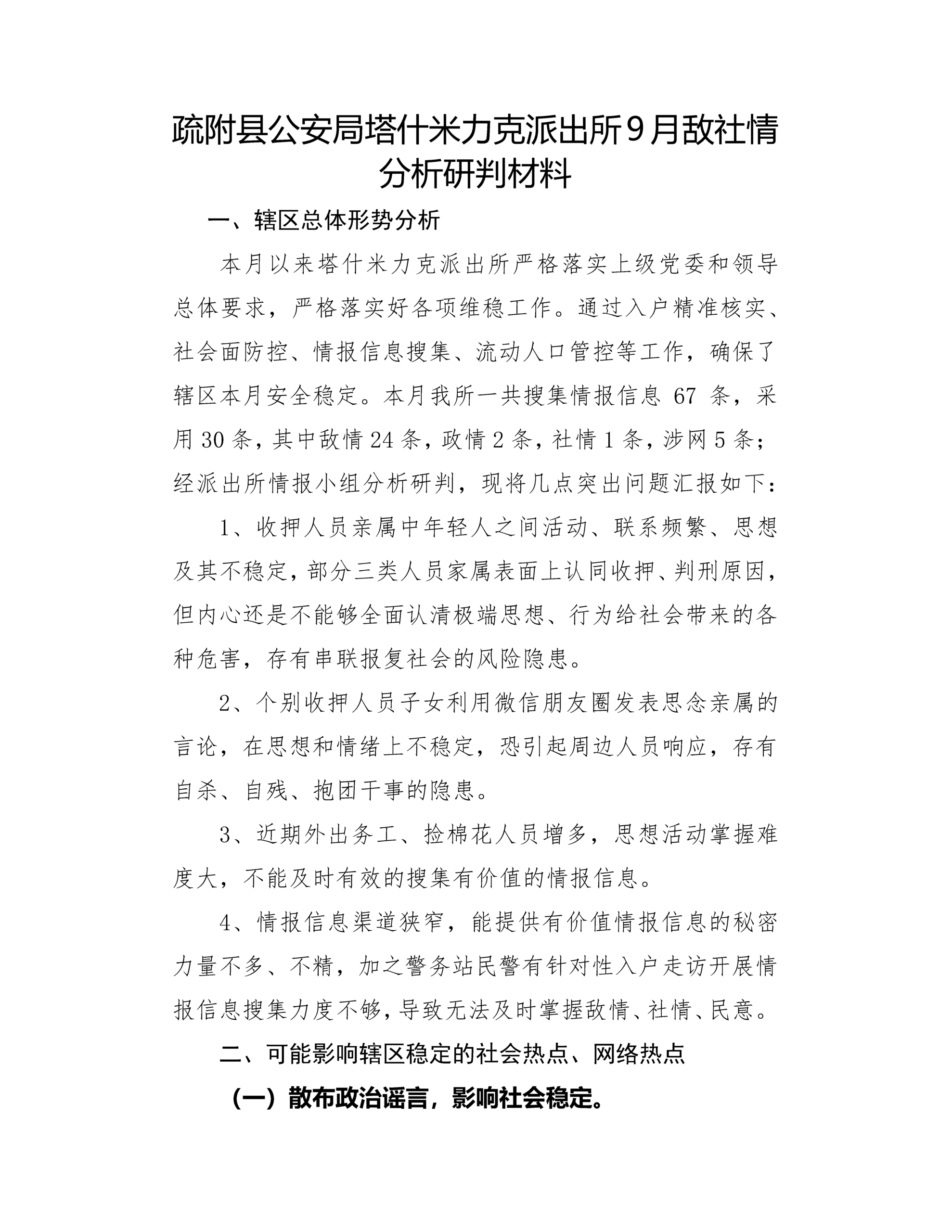This month, the Tashmiliq Police Station strictly implemented the overall requirements of the superior Party Committee and leadership, and diligently carried out stabilization work. Through door-to-door verification, social surface patrols, intelligence gathering, and floating population management, the jurisdiction has been maintained safely and stably. This month, our station collected 67 pieces of intelligence, utilized 30, including 24 concerning enemy situations, 2 concerning political situations, and 1 concerning social situations, with 5 involving the internet. After analysis and judgment by the station’s intelligence group, the following prominent issues are reported below: